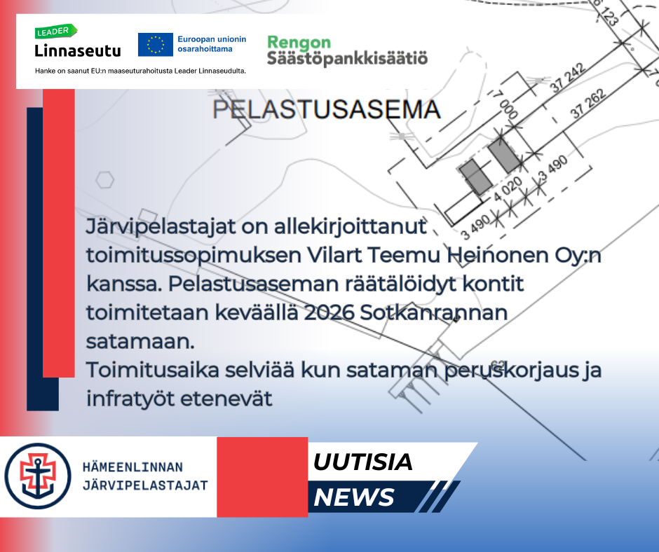 Hanke uudistaa yhdistyksen pelastusaseman Hämeenlinnan Sotkanrannan satamassa. Uudet tilat koostuvat kahdesta varustellusta kontista, jotka mahdollistavat varusteiden kuivatuksen, huollon ja säilytyksen paikan päällä. Lisäksi kontit toimivat toimistona ja katettuna työskentelytilana yhdistyksen sekä kumppaneiden koulutuksissa. Hanke toteutetaan keväällä 2026, ja lopullinen sijoituspaikka viimeistellään Sotkanrannan sataman kunnostuksen yhteydessä.