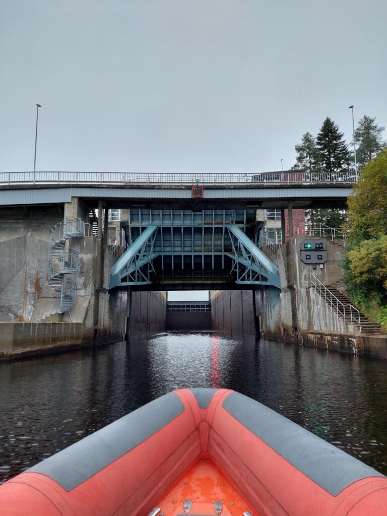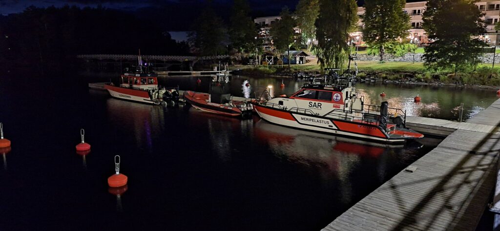 Pielisjoki on mutkineen ja maisemineen hieno kokemus, mutta sulutusten ja nopeusrajoitusten takia siihen on varattava runsaasti aikaa. Vesi oli nyt niin alhaalla, ettei kanavien lisäksi muita siltoja tarvinnut Saran tieltä kuitenkaan nostaa ylös. Ahveniselle päästyämme pysähdyimme lyhyesti miehistön jäsenen omalla mökillä, jonka riistakameraan hauskasti tallentui yhden järvipelastajan pelastuspuku heijastimineen. Kun matkaa jatkettiin klo 19.10, tuuli oli jo melkoinen ja ilta alkoi hämärtää. Loppumatka Nurmekseen menikin sitten täysin pimeässä ja navigointipareja vaihdettiin muutaman kerran. Pimeänavigointi vaatii niin paljon keskittymistä, että on hyvä vaihtaa vuoroja usein. Matkavauhti pimeässä pudotettiin noin 23 solmuun. Noin puoli kymmenen illalla päästiin perille Nurmekseen, jossa meitä oli vastassa yhdistyksemme päivystävä päällikkö ja lämmin mustaherukkamehu. Kaikilla oli kuivapuvut päällä, joten kylmä meillä ei ollut, mutta kyllä matka oli voimia verottanut ja mehu maistui mainiolta pitkän päivän päätteeksi. Vielä vaihdettiin varusteet sataman pukuhuoneessa, täytettiin lokikirja (kotimatkan mailit 160,7) ja vietiin pelastuspuvut ja -liivit kuivumaan.