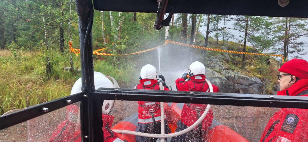 Neljäs rasti löytyi kauniista lahukasta, jossa meitä odotti palavan aluksen sammutusharjoitus. Laitoimme Saran moottoriruiskun valmiiksi ja ajoimme kuvitteellisen aluksen lähelle. Sammutusparista toinen suihkutti laajaa suihkua suojaten alustamme ja sammuttajia liekeiltä ja kuumuudelta, jolloin toinen sammutusparista pääsi keskittymään palavan kohteen sammuttamiseen. Kertasimme sammutustyöskentelyssä käytettävät käsimerkit samalla.